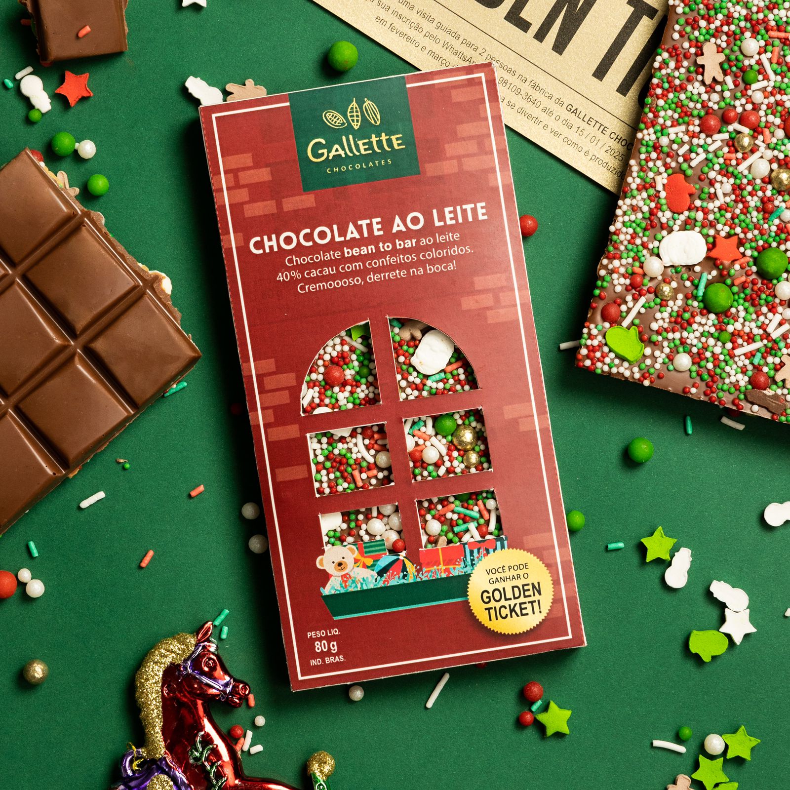 Nossa barra de chocolate ao leite, feita com nosso 40% cacau e decorada com confeitos coloridos e festivos, é como um passeio pela fábrica do Papai Noel, cheia de surpresas e doçura!