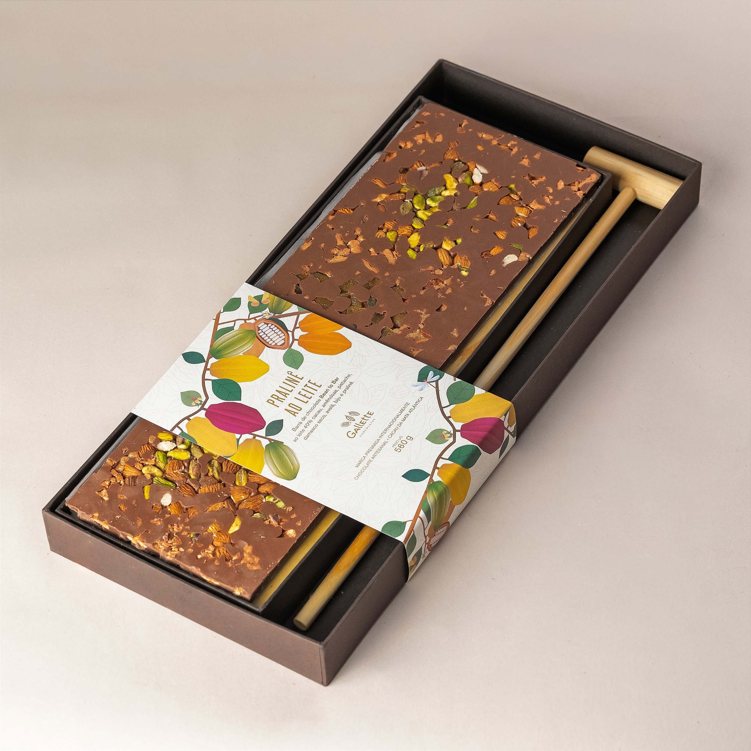Criada para ser compartilhada com a família e os amigos, acompanha uma tábua para apoiar na mesa e um martelo para quebrar os pedaços.