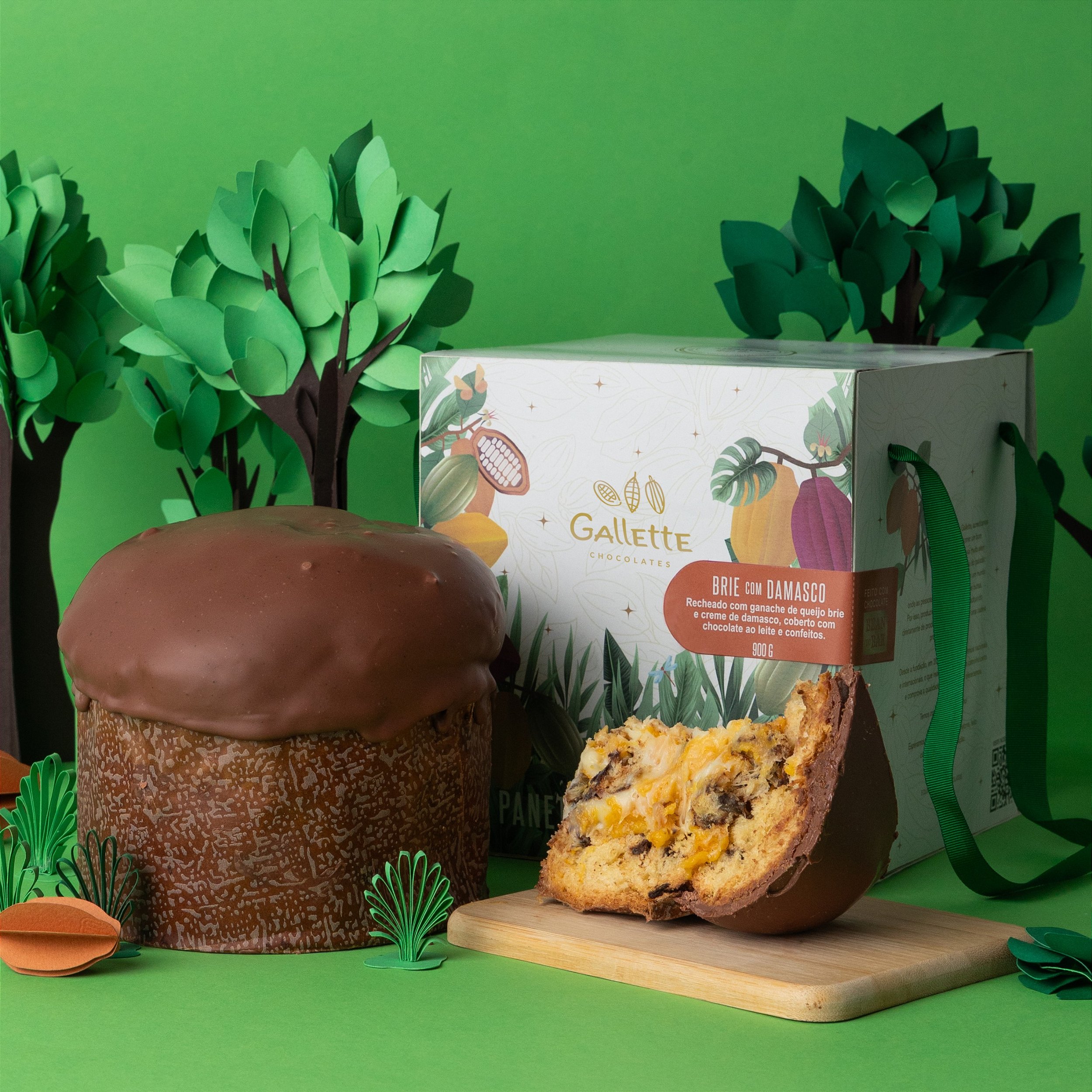 Feito com massa macia e úmida na medida certa, esse panetone é enriquecido com gotas de chocolate e um recheio cremoso de ganache de queijo brie combinado com um delicado creme de damasco, coberto com chocolate ao leite 40% cacau.