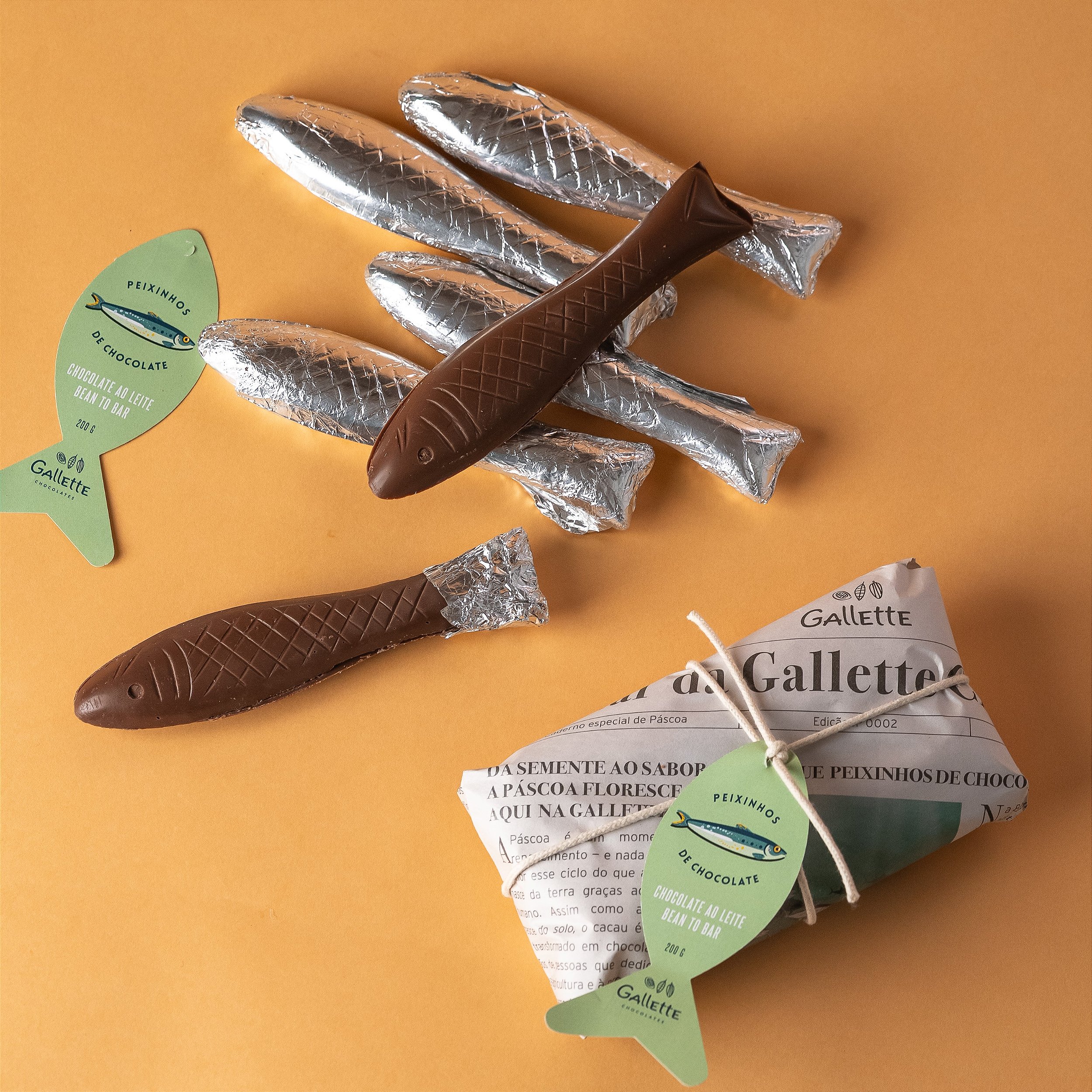 São 6 peixinhos feitos com chocolate ao leite 40% cacau, cremoso e equilibrado, moldados artesanalmente e embalados no jornal, como os peixes das feiras antigas. Uma combinação de memória afetiva e chocolate bean to bar de verdade.